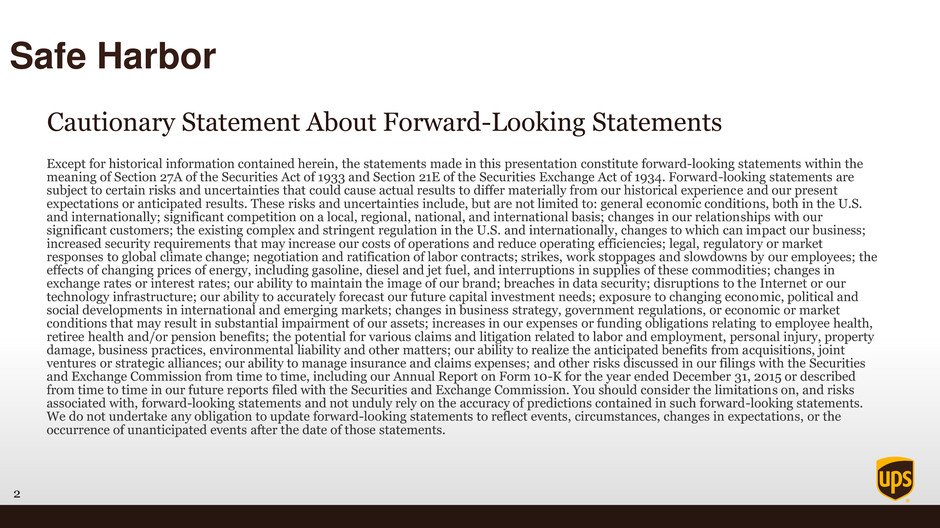 2 Safe Harbor Except for historical information contained herein, the statements made in this presentation constitute forward-looking statements within the meaning of Section 27A of the Securities Act of 1933 and Section 21E of the Securities Exchange Act of 1934. Forward-looking statements are subject to certain risks and uncertainties that could cause actual results to differ materially from our historical experience and our present expectations or anticipated results. These risks and uncertainties include, but are not limited to: general economic conditions, both in the U.S. and internationally; significant competition on a local, regional, national, and international basis; changes in our relationships with our significant customers; the existing complex and stringent regulation in the U.S. and internationally, changes to which can impact our business; increased security requirements that may increase our costs of operations and reduce operating efficiencies; legal, regulatory or market responses to global climate change; negotiation and ratification of labor contracts; strikes, work stoppages and slowdowns by our employees; the effects of changing prices of energy, including gasoline, diesel and jet fuel, and interruptions in supplies of these commodities; changes in exchange rates or interest rates; our ability to maintain the image of our brand; breaches in data security; disruptions to the Internet or our technology infrastructure; our ability to accurately forecast our future capital investment needs; exposure to changing economic, political and social developments in international and emerging markets; changes in business strategy, government regulations, or economic or market conditions that may result in substantial impairment of our assets; increases in our expenses or funding obligations relating to employee health, retiree health and/or pension benefits; the potential for various claims and litigation related to labor and employment, personal injury, property damage, business practices, environmental liability and other matters; our ability to realize the anticipated benefits from acquisitions, joint ventures or strategic alliances; our ability to manage insurance and claims expenses; and other risks discussed in our filings with the Securities and Exchange Commission from time to time, including our Annual Report on Form 10-K for the year ended December 31, 2015 or described from time to time in our future reports filed with the Securities and Exchange Commission. You should consider the limitations on, and risks associated with, forward-looking statements and not unduly rely on the accuracy of predictions contained in such forward-looking statements. We do not undertake any obligation to update forward-looking statements to reflect events, circumstances, changes in expectations, or the occurrence of unanticipated events after the date of those statements. Cautionary Statement About Forward-Looking Statements