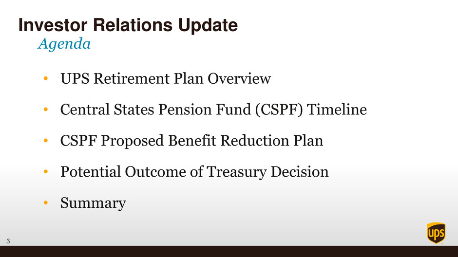 3 Investor Relations Update • UPS Retirement Plan Overview • Central States Pension Fund (CSPF) Timeline • CSPF Proposed Benefit Reduction Plan • Potential Outcome of Treasury Decision • Summary Agenda