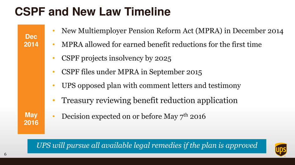 5 • Withdrawal from CSPF negotiated in IBT Master Agreement • New jointly trusteed plan created – UPS/IBT Plan • $6.1B payment to Central States – to exit, limiting future liability • $1.7B liability to restore lost benefits • Agreement included Backstop provision • If legally permitted to reduce benefit payments • CSPF was healthy after UPS exited from the plan • NPV positive and cost impact as projected Central States Pension Fund Timeline Right thing for UPS employees, customers and shareowners Dec 2007 Dec 2007