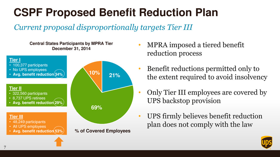 6 • New Multiemployer Pension Reform Act (MPRA) in December 2014 • MPRA allowed for earned benefit reductions for the first time • CSPF projects insolvency by 2025 • CSPF files under MPRA in September 2015 • UPS opposed plan with comment letters and testimony • Treasury reviewing benefit reduction application • Decision expected on or before May 7th 2016 CSPF and New Law Timeline Dec 2014 May 2016 Dec 2014 May 2016 UPS will pursue all available legal remedies if the plan is approved