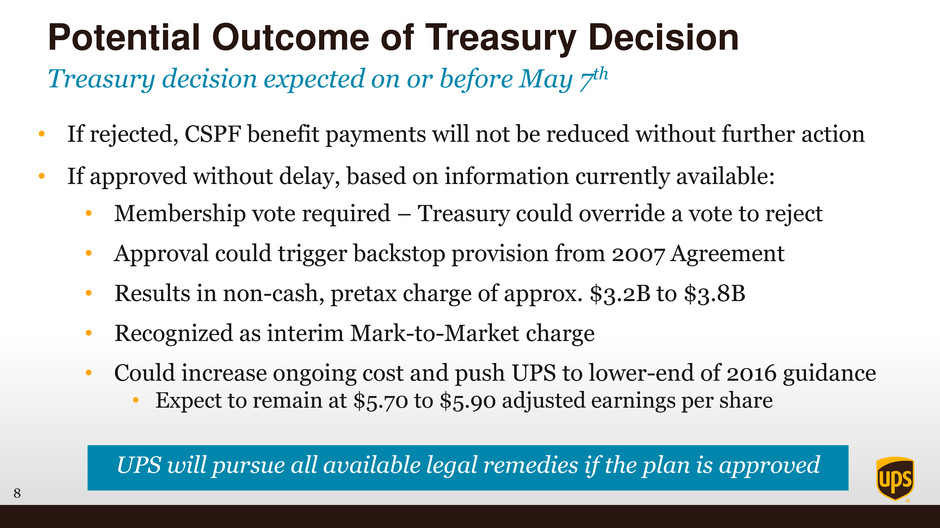 7 • MPRA imposed a tiered benefit reduction process • Benefit reductions permitted only to the extent required to avoid insolvency • Only Tier III employees are covered by UPS backstop provision • UPS firmly believes benefit reduction plan does not comply with the law CSPF Proposed Benefit Reduction Plan Current proposal disproportionally targets Tier III 21% 69% 10% Tier II • 322,560 participants • 8,737 UPS retirees • Avg. benefit reduction 29% Tier I • 100,377 participants • No UPS employees • Avg. benefit reduction 34% Tier III • 48,249 participants • All UPS employees • Avg. benefit reduction 53% Central States Participants by MPRA Tier December 31, 2014 % of Covered Employees