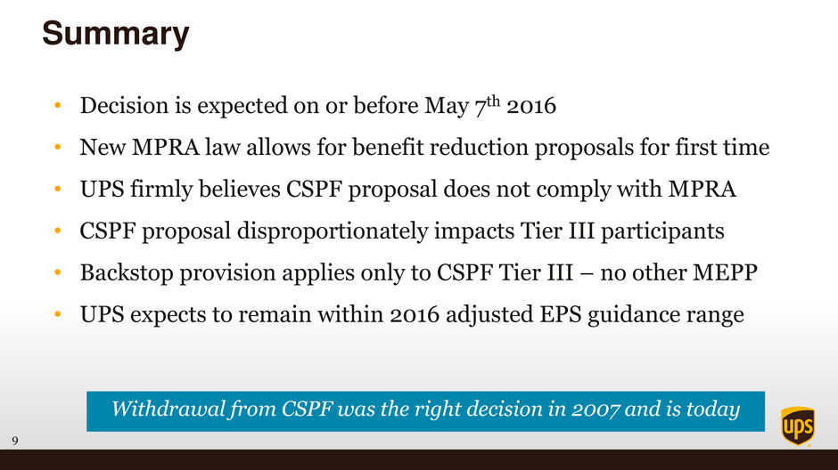 8 • If rejected, CSPF benefit payments will not be reduced without further action • If approved without delay, based on information currently available: • Membership vote required – Treasury could override a vote to reject • Approval could trigger backstop provision from 2007 Agreement • Results in non-cash, pretax charge of approx. $3.2B to $3.8B • Recognized as interim Mark-to-Market charge • Could increase ongoing cost and push UPS to lower-end of 2016 guidance • Expect to remain at $5.70 to $5.90 adjusted earnings per share Potential Outcome of Treasury Decision Treasury decision expected on or before May 7th UPS will pursue all available legal remedies if the plan is approved